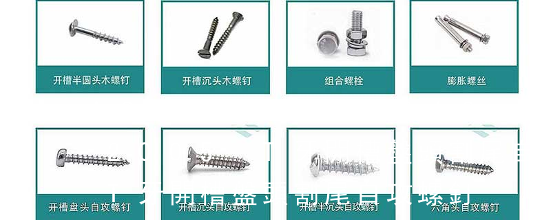 主要分類包括普通螺絲、機螺絲、自攻螺絲和膨脹螺絲三種。 有頭螺釘Cap screw 過去限于全牙的扣件。 六角頭螺釘Hex cap screw與大六角螺栓Hex bolt 顧名思義為頭部為六角型的外螺紋扣件,設計為使用扳手轉動。依照ASME B18.2.1標準,六