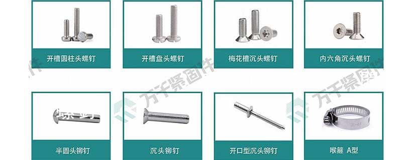 其它類:焊釘、拉鉚釘、牙棒、化學錨栓、鋼絲螺套、進口喉箍、開口銷、自鎖螺釘、彈性圓柱銷、圓柱銷、圓錐銷、扁圓頭鉚釘、平頭鉚釘、沉頭鉚釘、半圓頭鉚釘、內六角 平端緊定螺絲、內六角尖端緊定螺絲、內六角凹端緊定螺絲 皮帶釘, 盤頭螺釘, 蝶形螺釘, 手緊螺釘, 開槽螺釘, 緊定螺釘, 組合螺釘, 鉆尾螺釘, 木螺釘, 半圓頭螺釘, 圓頭螺釘, 纖維板釘, 鉆尾螺釘, 墻板釘, 電動機斷路器,